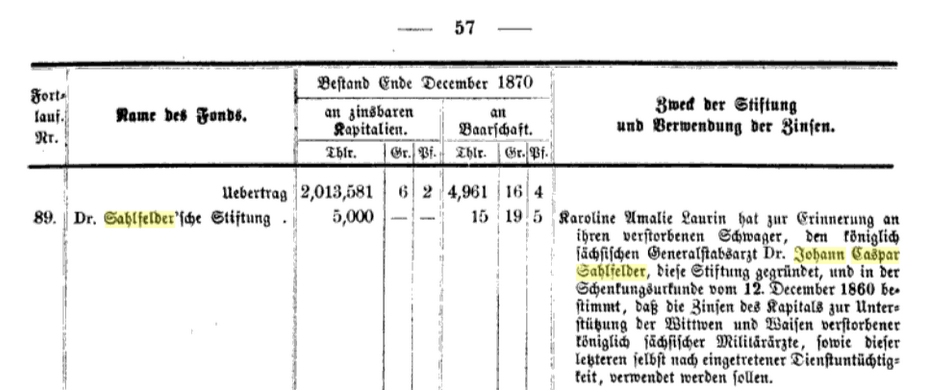 Die Dr. Sahlfelder‘sche Stiftung wurde von seiner Schwägerin Karoline Amalie Laurin 1860 aufgrund seines Testaments gegründet (nach ihr ist die Laurinstr. in der Wilsdruffer Vorstadt benannt). Die aus dieser Stiftung gewonnenen Zinsen sollten zur Unterstützung der Witwen und Waisen verstorbener königlich-sächsischer Militärärzte bzw. dienstunfähiger Militärärzte verwendet werden.