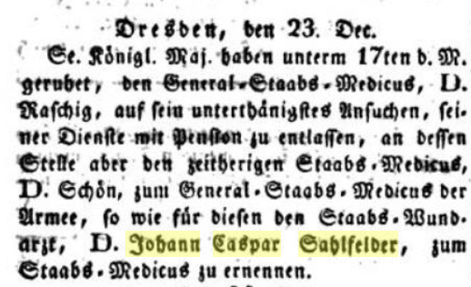• 1828: Generalstabsmedikus als Nachfolger von Heinrich August Schön. In dieser Funktion übernimmt er als Generalstabsarzt des sächsischen Heereskontingents die Leitung des sächsischen Sanitätsdienstes.